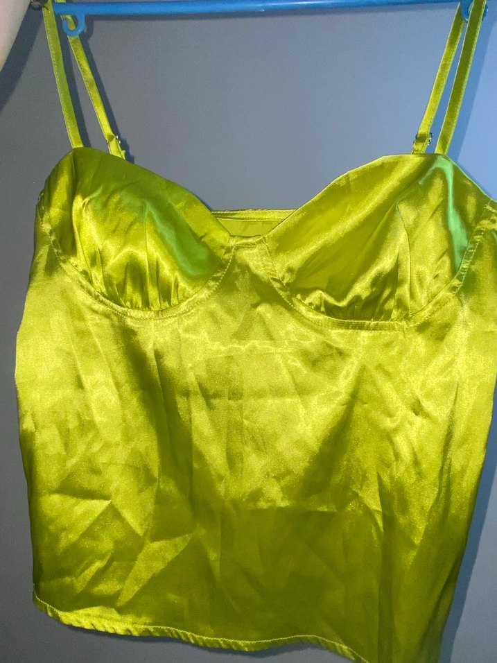 Parlak yeşil renkte, askılı ve drapeli detaylara sahip, saten görünümlü, vücuda oturan kadın büstiyer. Vintage tarzıyla parti için uygun.