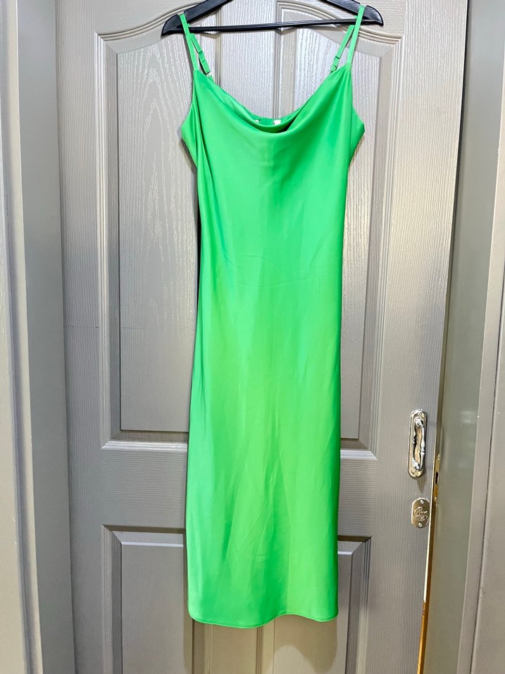 Parlak sentetik kumaştan, askılı ve drapeli detaylı, yeşil uzun ve vücuda oturan elbise, parti için uygun.