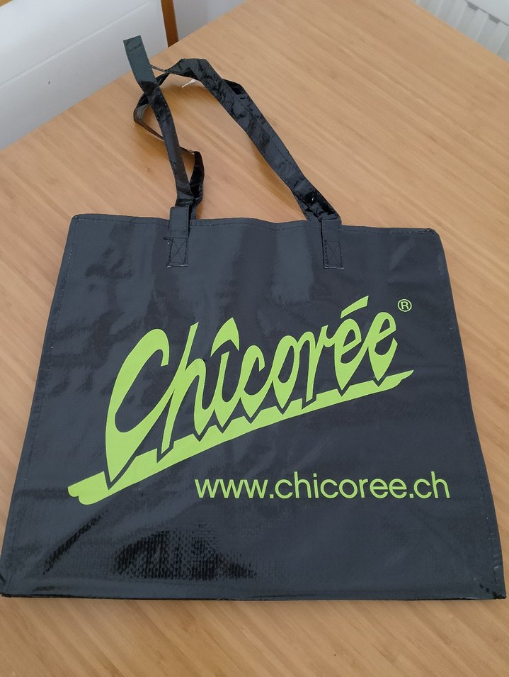 Yeşil parlak baskılı, fermuarlı, kadın tote çanta. Sentetik kumaştan, spor ve trend günlük tarzlara uygun. Chicoree logosu ve web sitesi baskılı. boy 34/eni40 cm.