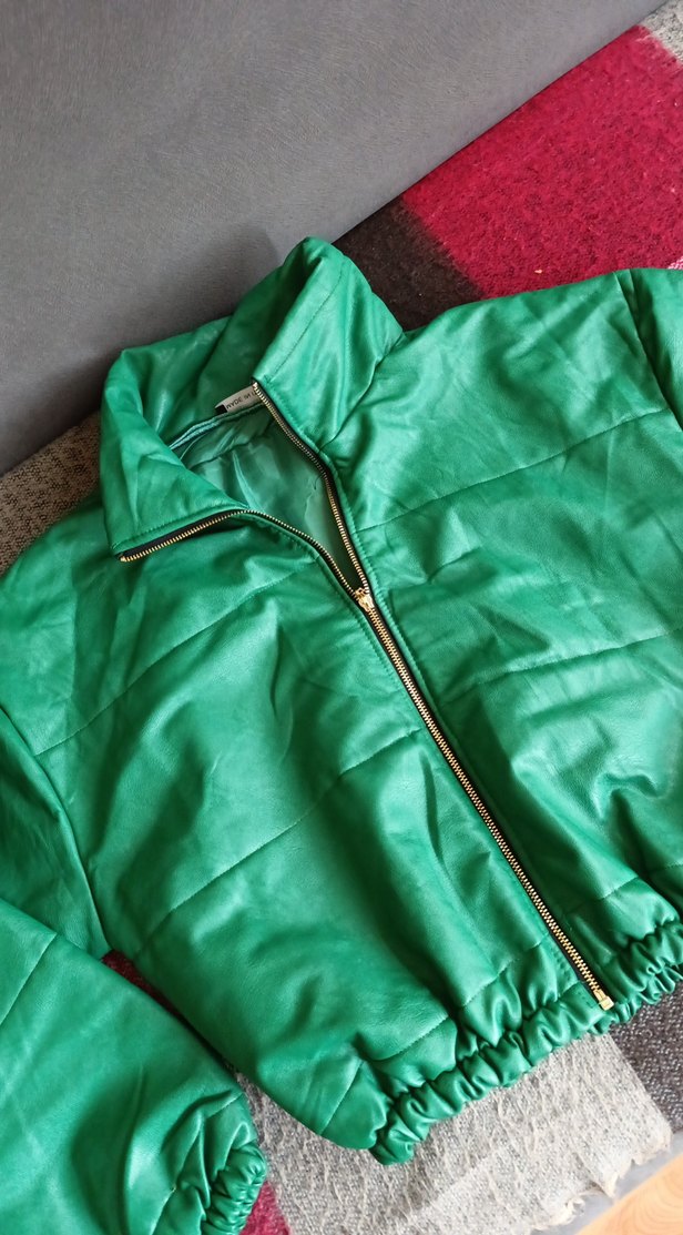 Parlak yeşil deri, yüksek yakalı ve fermuarlı ön kısmı olan, dar kesim uzun kollu kadın ceketi. Günlük kullanım için ideal, sokak modasına uygun bir parça.