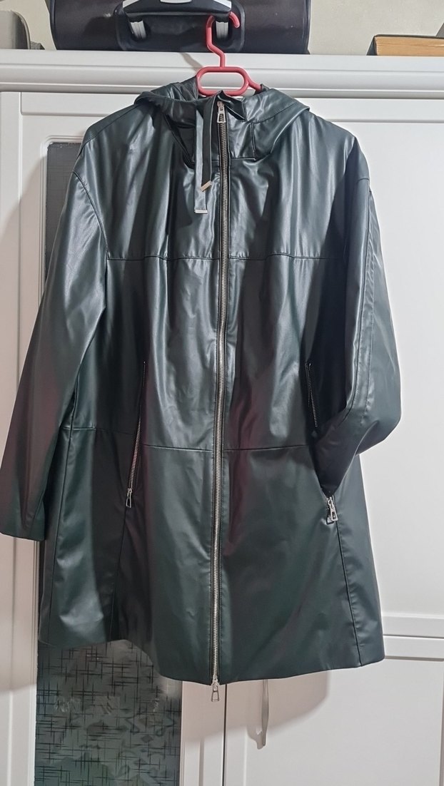 Yeşil parlak deri kadın yağmurluk, çıtçıtlı yakalı ve fermuarlı önden kapanışlıdır. Gevşek kesim ve normal midi boydadır. ️