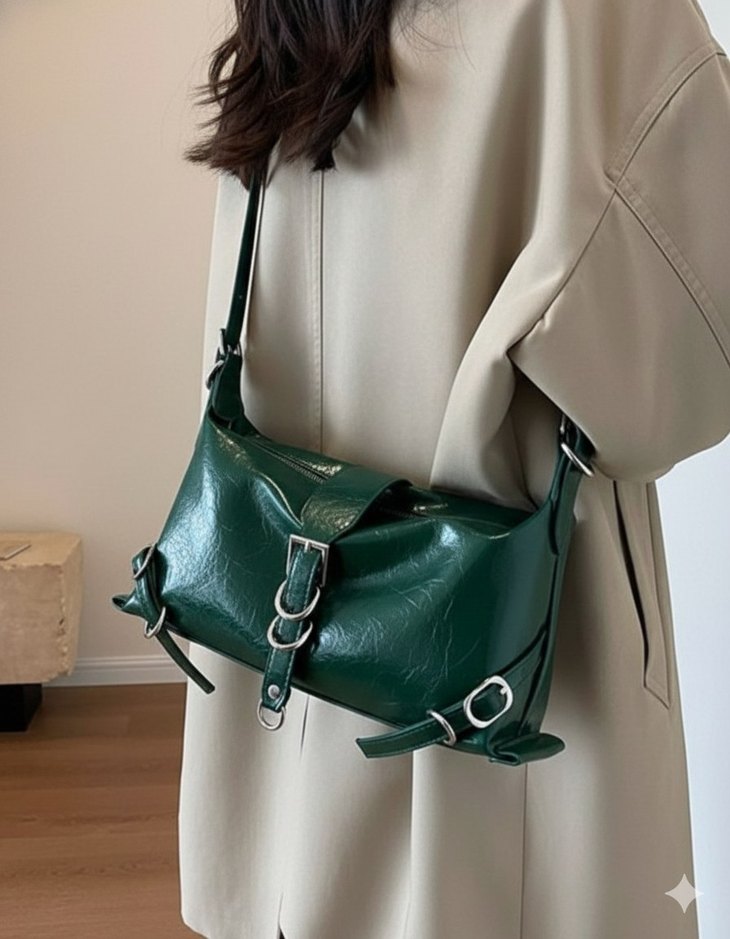 Yeşil parlak deri malzemeden üretilmiş, tokalı tasarıma sahip minimalist kadın omuz çantasıdır. Günlük kullanıma uygundur ve trend şıklık sunar.