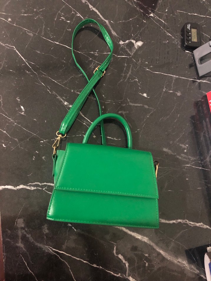 Yeşil parlak deri, tokalı kayış ve hafif yılan deseni bulunan minimalist tarzda günlük kullanıma uygun kadın çantası.