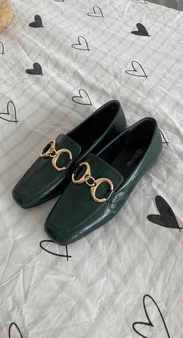 Ofis kullanımı için uygun, yeşil parlak deri, tokalı ve yılan derisi desenli kadın loafer, kalın topuklu.