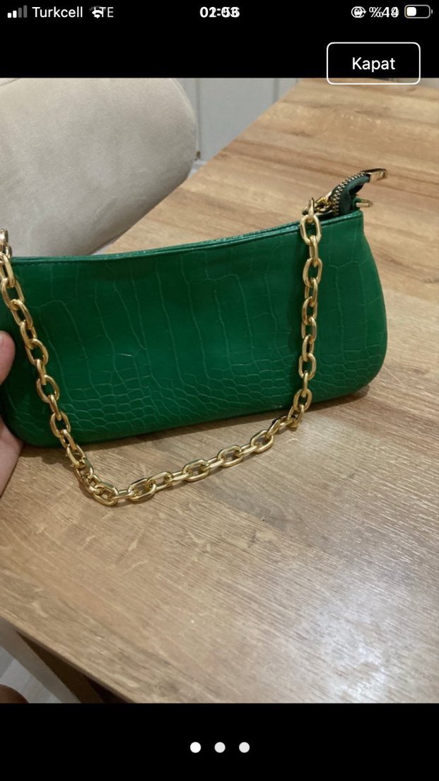 Yılan desenli, parlak yeşil deri, altın renk zincir detaylı çanta. Bohem tarzıyla günlük kullanıma uygun.