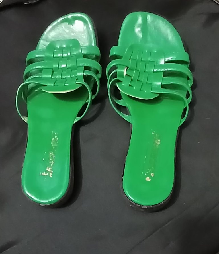 Parlak yeşil renkte, dolgu topuklu ve tokalı bantlara sahip kadın terlikleri. Minimalist yılan desenli, bohem tarzını yansıtır.