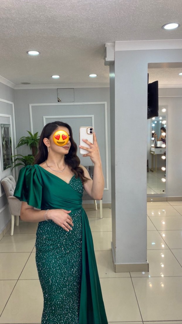 Yeşil renkli, markası samet keskindir,drapeli tasarıma sahip uzun abiye elbise. Straplez yaka ve kısa kollu, parlak baskılı kumaştan, düzenli kesim sadece 1 kere giyildi çok ufak kusurlar dışında çok iyi durumda ister tek kolu ister iki kolu da kulanıla bilir ..