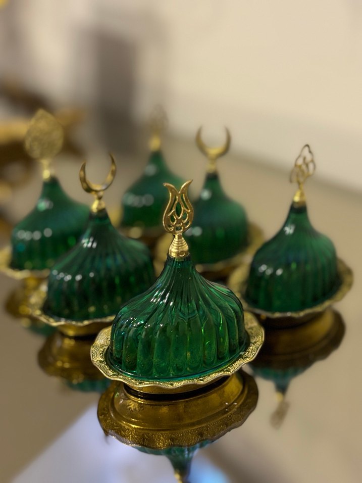 Parlak yeşil kapaklar ve etnik desenlere sahip, zarif altın renkli tabanlarla gelen geleneksel tasarımlı kahve yanı lokumluk