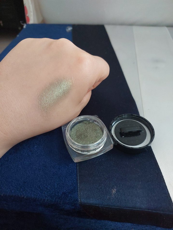 Yeşil ışıltılı far, küçük kapta ve kapağı açık şekilde gösterilmiştir. Ciltte uygulanmış görünümüyle parlıyor.