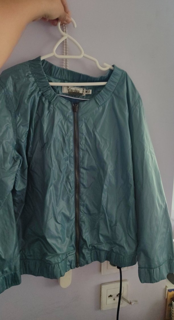 Fermuarlı, yeşil parlak sentetik kumaştan, yuvarlak yakalı, uzun kollu, bol kesim kadın ceketi. Günlük kullanım için uygun midi boyda.