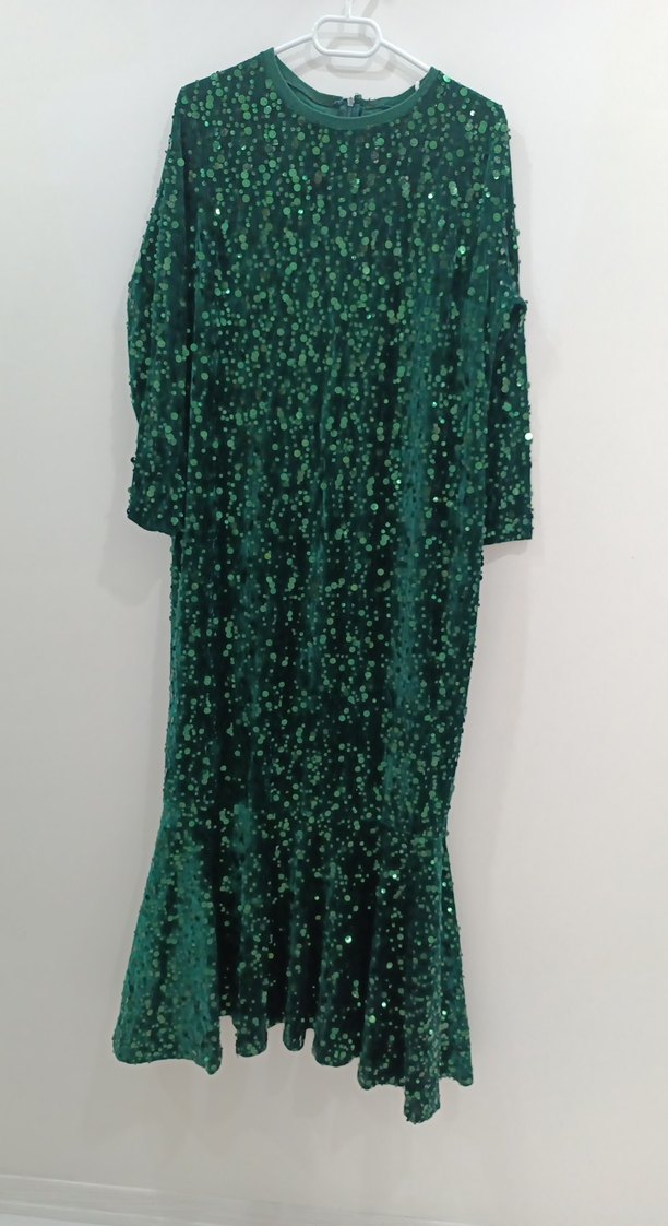 Parlak zumrut yeşil renkte, işlemeli ve payet uzun kolu, vücuda oturan etek uçlu fırfır detay abiye elbise balık model sımıt yaka