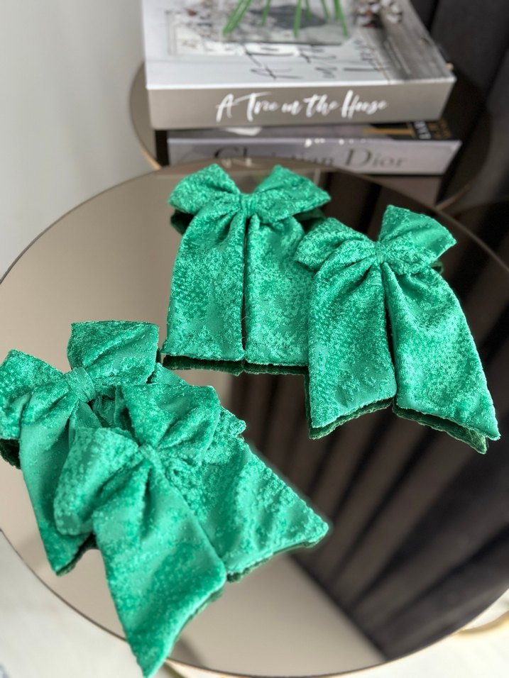 Yeşil parlak sentetik kumaştan yapılmış fiyonk saç aksesuarları, sokak modasına uygun şık ve avangart bir görünüm sunar.