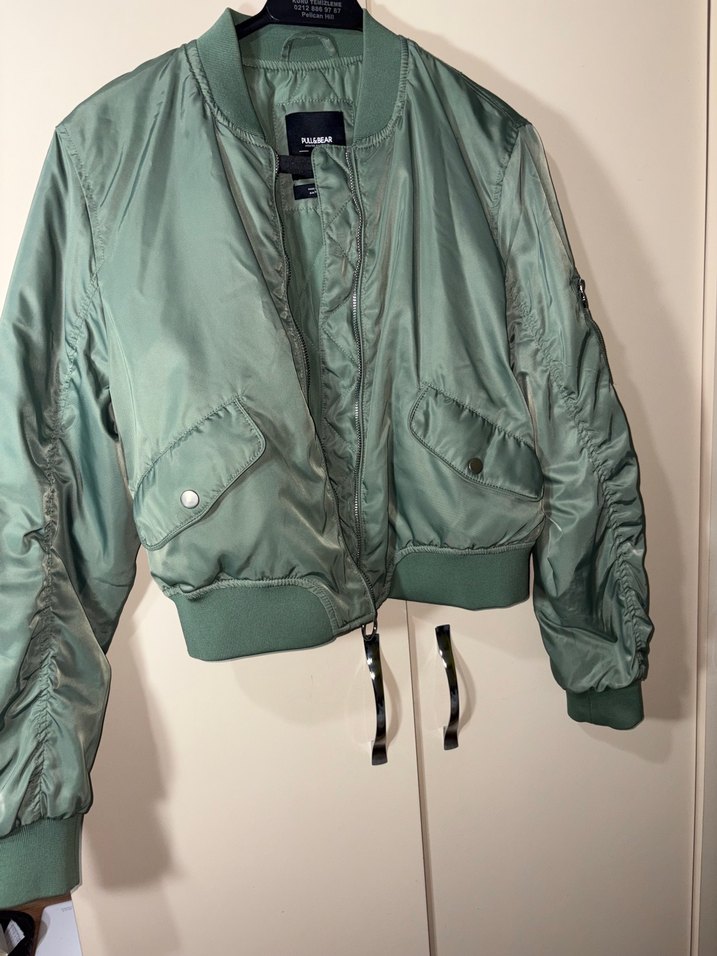 Bu dar kesim kadın ceket, parlak yeşil sentetik kumaştan olup, çentikli yaka ve uzun kolludur. Fermuarlı detayları ve normal midi boyuyla günlük kullanım için uygundur.