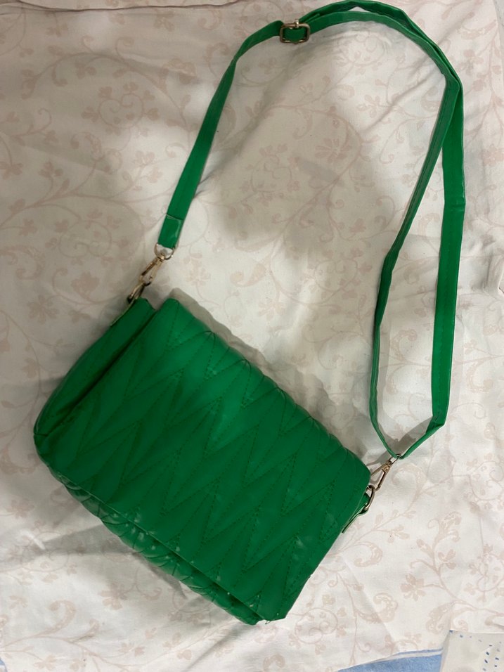 Parlak yeşil renkte, fermuarlı ve minimalist tasarımlı kadın omuz çantası. Sentetik kumaştan yapılmıştır ve bohem, hippie, retro tarzlarına uygundur.