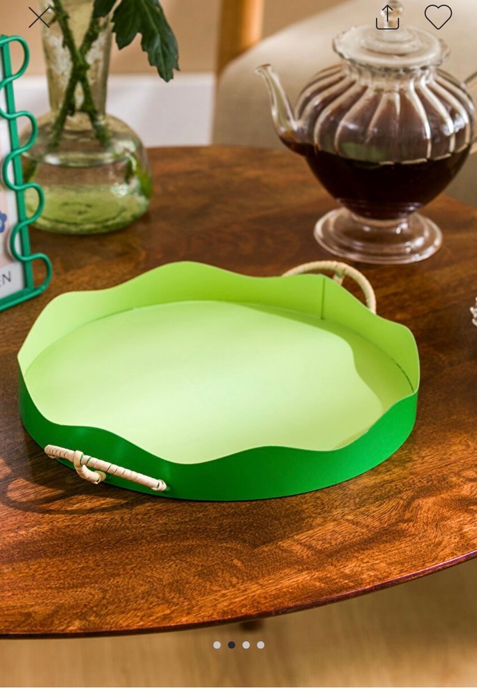 Parlak yeşil renkli, ip tutacaklı kek kalıbı ve sunum tepsisi olarak kullanılabilir.