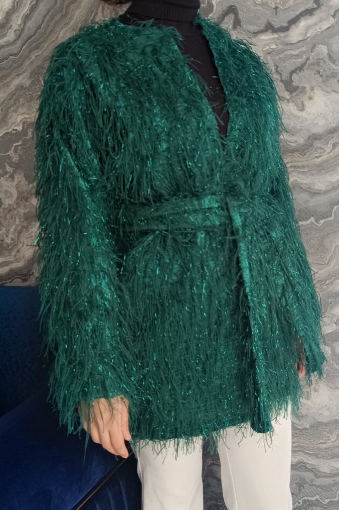 Yeşil parlak ceket.uzun kollu ve bol kesimdir. Bohem tarzı, yakalı ve kemerli modeldir.özel günler için kullanıma uygundur.