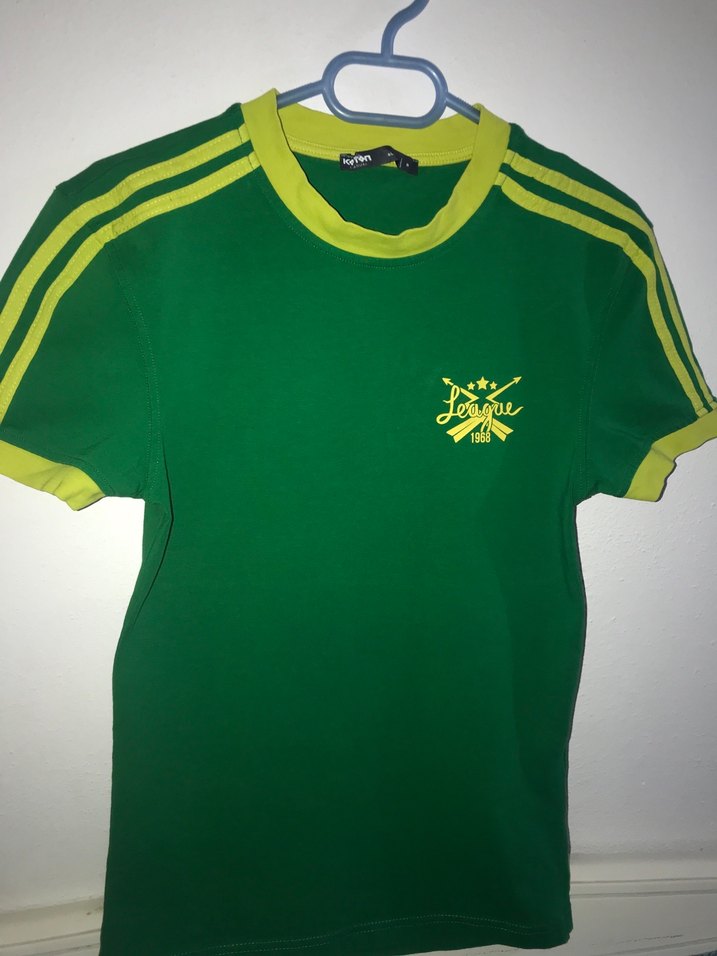 Parlak yeşil sentetik kumaştan, kısa kollu ve bisiklet yaka erkek tişörtü. Sarı detaylar ve baskılı desen ile velcro özelliği bulunur.