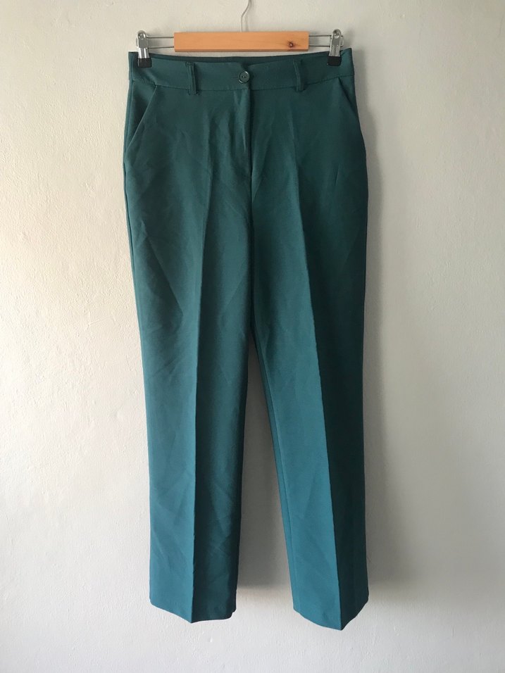 Yeşil parlak kumaştan, normal boy midi kesim, rahat kalıp kadın pantolon. Minimalist ve normcore tarzıyla ofis için uygun, kolay şıklık sunar. Bel 38cm.basen 48cm.Boy:104cm paça genişliği:22cm.%97 polyester %3likra.Petrol yeşili.1 kez giyildi üstte şahane duruyor.Kusursuz temiz