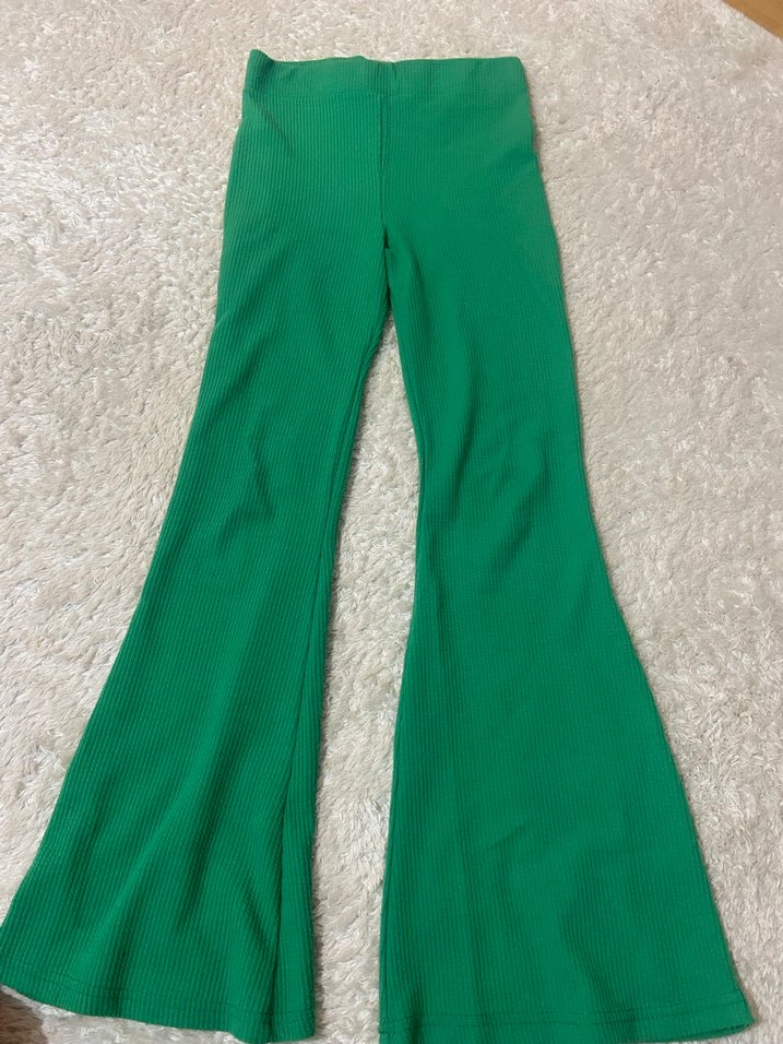 Yumuşak sentetik kumaştan yapılmış, yeşil, üstü dar kesim ispanyol pantolon. Rahat, bohem tarzda günlük kullanıma uygun.