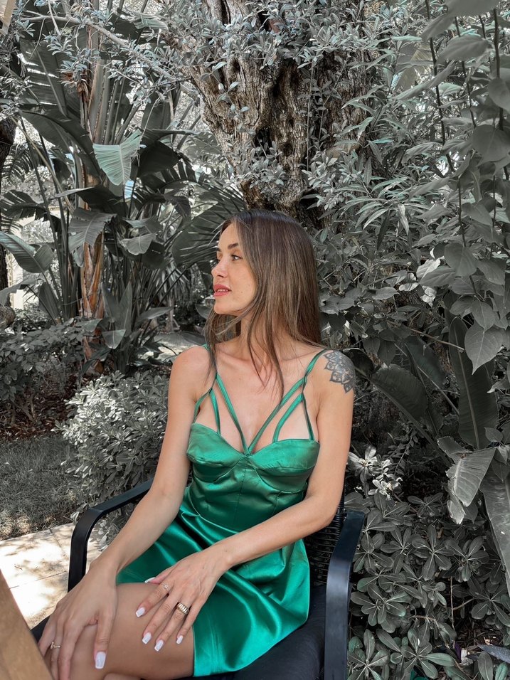 Parlak yeşil drapeli, saten dokulu, fit kesim mini elbise.