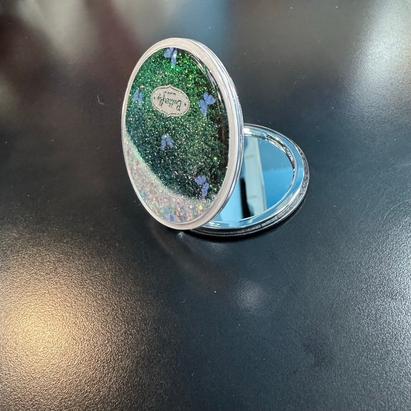 Parlak yeşil simli yüzeye sahip oval kompakt cep aynası, çantada taşımaya uygundur.