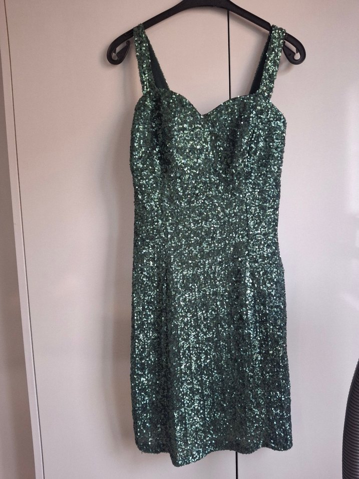 Parlak payetlerle kaplı, yeşil renkli, kolsuz ve vücuda oturan midi abiye elbise, şık partiler için uygundur. ✨