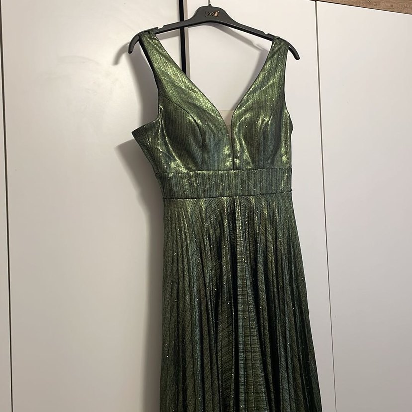 V yaka ve ince askılı, parlak yeşil pilili kumaştan yapılmış, bağlama desenli, modern klasik tarzda, vücuda oturan uzun abiye elbise. ✨ S bedene uyumlu.