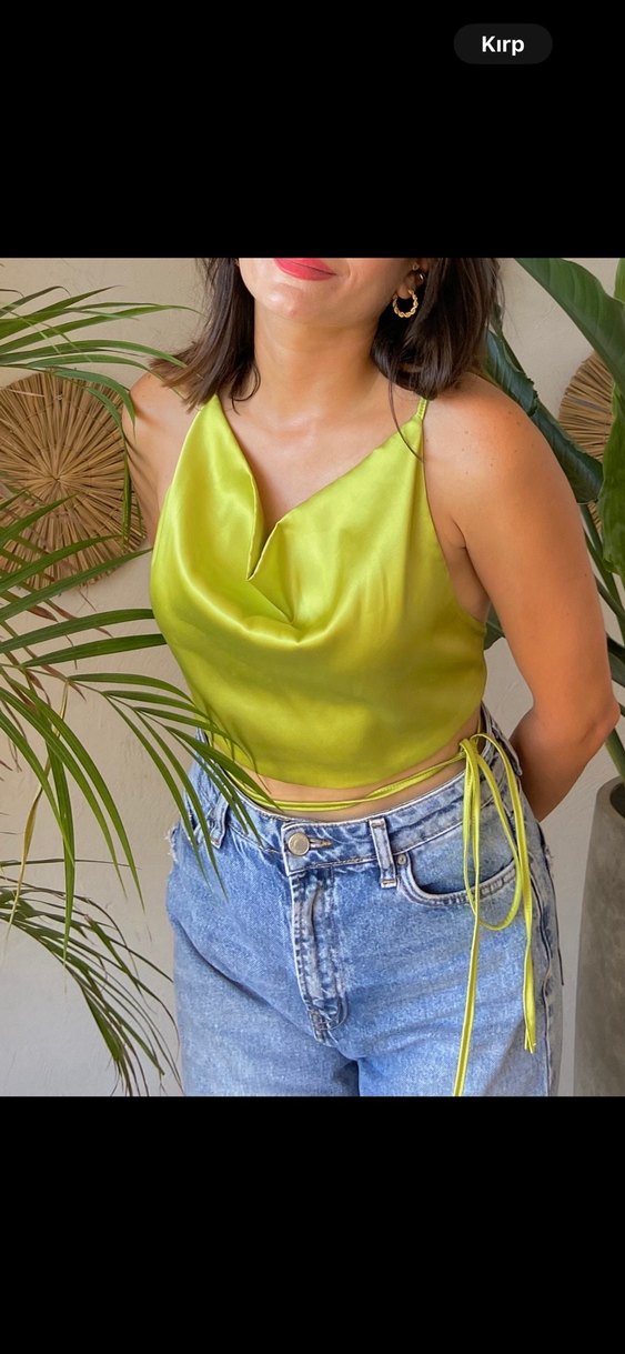 Yeşil parlak saten kumaştan, drapeli halter yaka ve ince askılı, bol kesim kısa crop top. Günlük sokak tarzına uygun rahat bir parça.