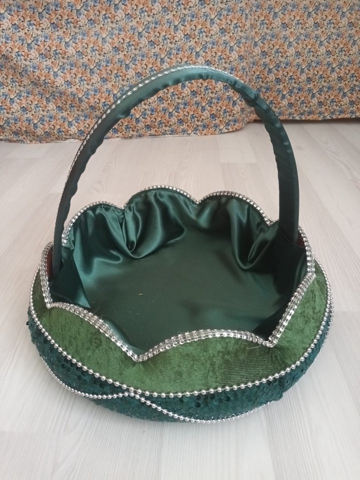 1 defa kullandım Kına Gecesinde hiç bir sorunu yoktur Yeşil parlak saten kumaştan, taş süslemeli ve dalgalı kenarlı, çıkarılabilen saplı sepet. sapını çıkartıp Kına tepsisi olarak da kullanabilirsiniz
