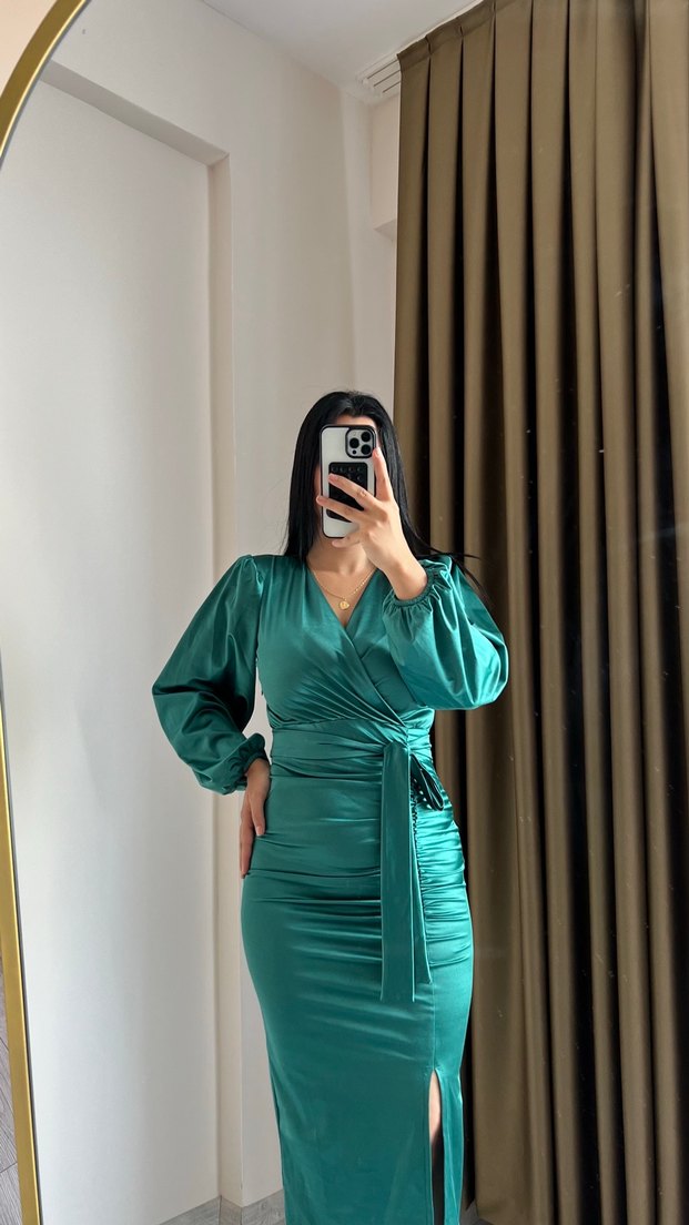 Yeşil renkli, saten dokulu, uzun kollu ve V yakalı bu uzun elbise, belden kuşaklı ve vücuda oturan kesimiyle çok şık bir tasarım ✨Yeni . Çok pahalıya aldığım için bu şekilde son fiyat canlarım