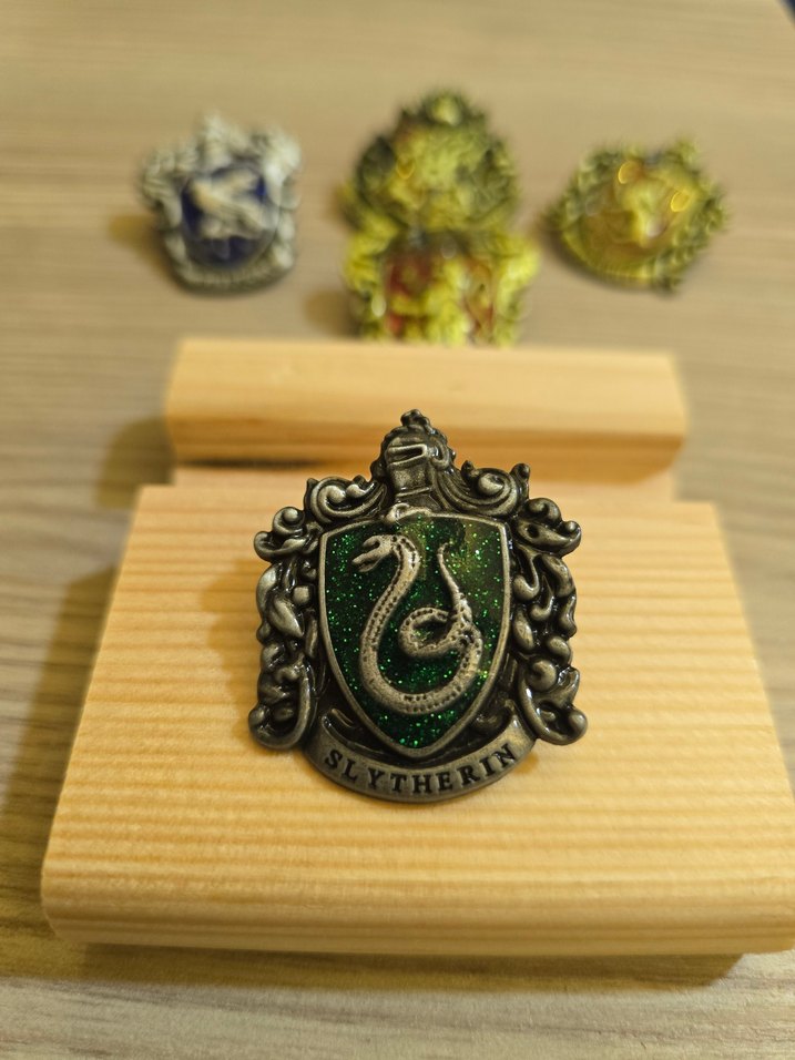 Parlak yeşil Slytherin rozeti, bohem tarzda ve gotik havasıyla yılan figürü ve detaylı çerçeveye sahiptir.