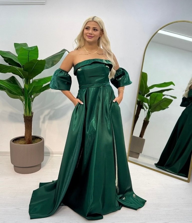 Yeşil Parlak Straplez Uzun Abiye Elbise