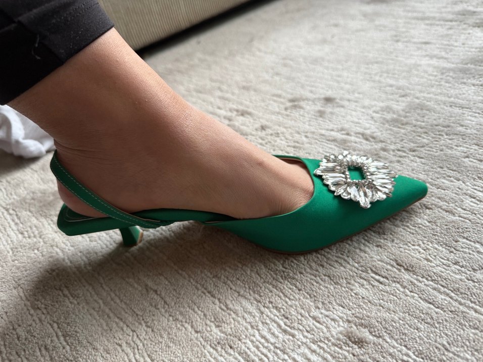 Kadın abiye ayakkabılar, stiletto topuklu ve parlak yeşil sentetik kumaştan yapılmıştır. Çiçek desenli ve taşlı süslemelidir, düğünler için uygundur.