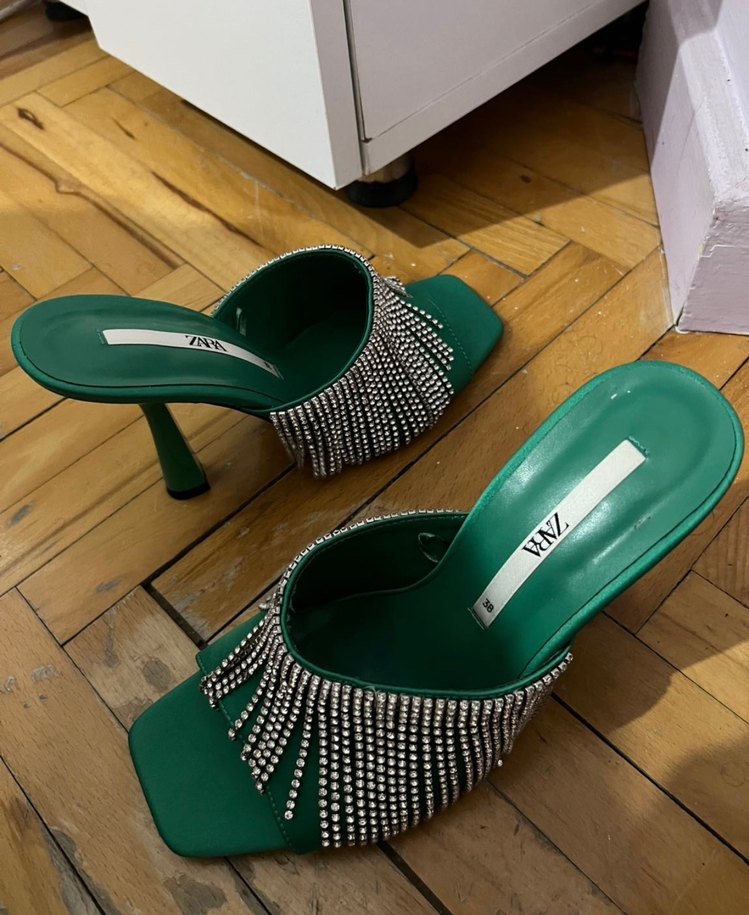 Yeşil parlak taşlarla süslenmiş yüksek topuklu kadın ayakkabısı. Kauçuk tabanlı, çağdaş ve göz alıcı tasarımıyla parti için uygun. Hiç giyilmedi Zara’dan aldım