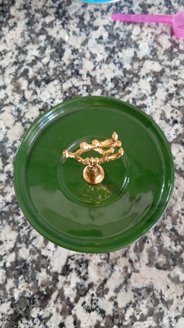 Parlak yeşil renkte, altın renkli tutacağa sahip, desensiz ve counterculture tarzında bir tepsi. ️