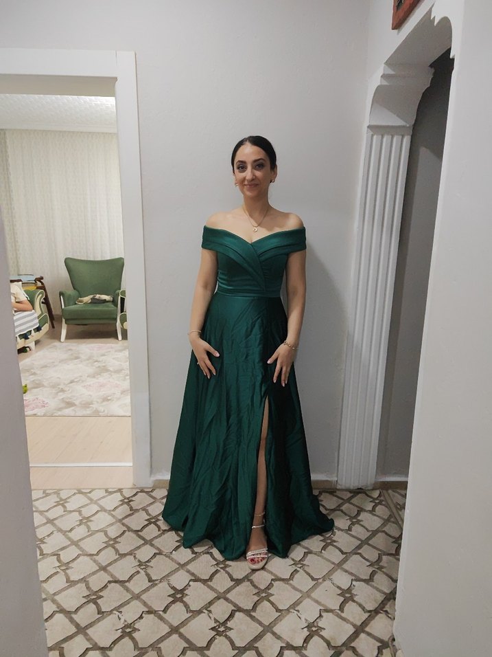 Yeşil parlak uzun abiye elbise, drapeli tasarım, kayık yaka ve ince askılı kollara sahiptir. Düz kesim ve yırtmaç detaylı, düğünler için uygundur. 169 boy 64 kilo ile giyilmiştir.