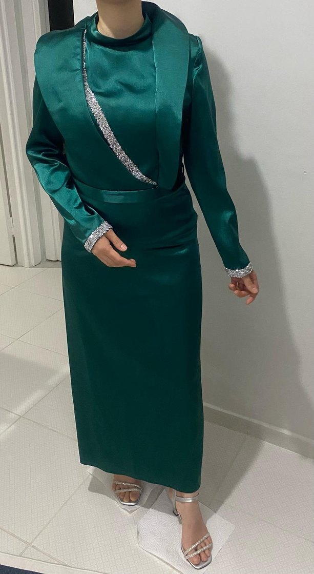 Yeşil, parlak uzun kollu abiye elbise, yüksek yakalı ve drapeli detaylara sahiptir. Düğünler için uygun, modern ve mütevazı bir tarza sahiptir. ✨38 Beden