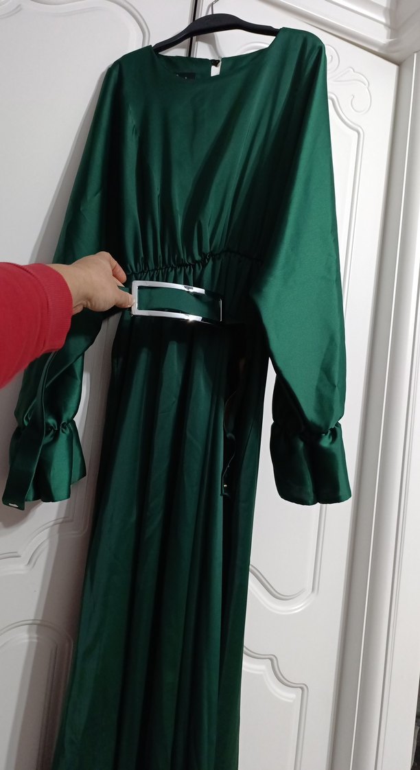Yeşil, parlak ve ipeksi kumaştan uzun kollu, kemerli uzun elbise. Bohem ve avangard tarzıyla günlük kullanıma uygundur. sadece kemerinde soyulma var yapistirilabilir iyi durumda dolabımi bosaltiyorum o yüzden uyguna veriyorum