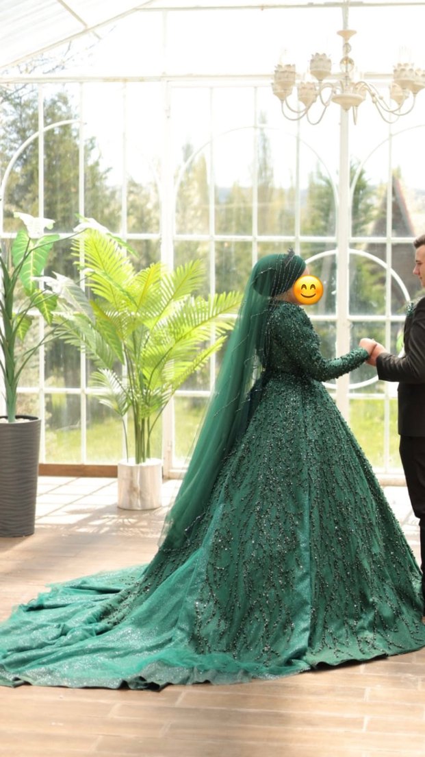 Yeşil parlak kumaştan, uzun kollu ve yüksek yakalı, drapeli, desenli, modest ve gotik tarzda nişan elbisesi. Sadece 1defa giyildi duvak dahil satılıktır.