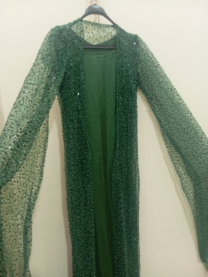 Yeşil parlak kumaştan, uzun kollu ve kare yakalı yöresel elbise