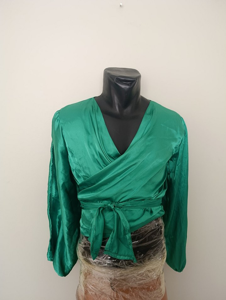 Yeşil parlak kumaştan, drapeli V yaka ve uzun kollu, bol kesim kadın bluz. Belde bağcık detayı bulunur, parti için uygundur.