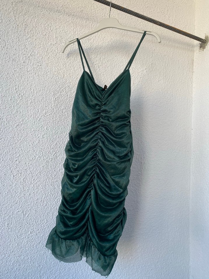 Yeşil parlak yılan desenli, drapeli ve ince askılı V yakalı uzun, vücuda oturan abiye elbise, avant-garde parti stiline uygun. Likralıdır