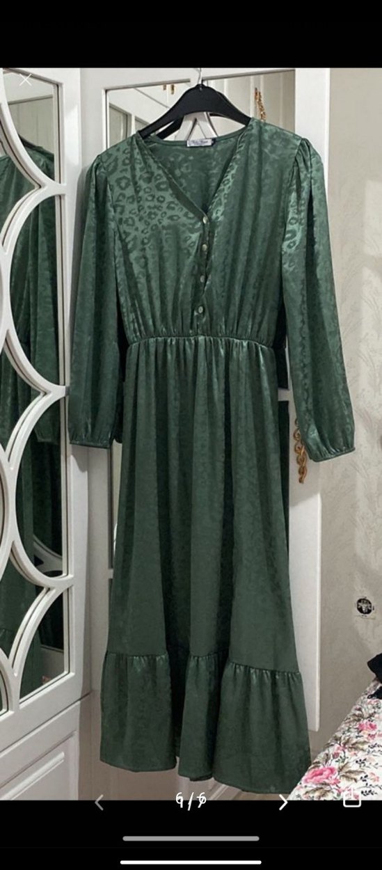 Yeşil renkli, parlak yılan desenli, düğmeli, uzun kollu, V yakalı, bol kesim, sentetik kumaştan bohem vintage tarzı uzun kadın elbisesi.