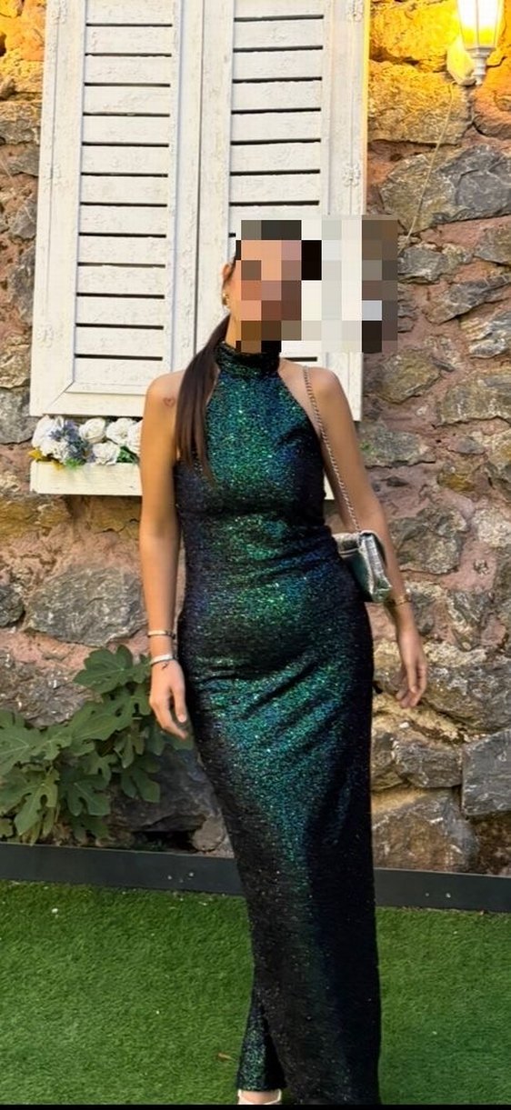 Yeşil parlak yılan desenli, uzun ve vücuda oturan, yüksek yakalı ve kolsuz abiye elbise.arkasında diz kapağına kadar yırtmaçlı