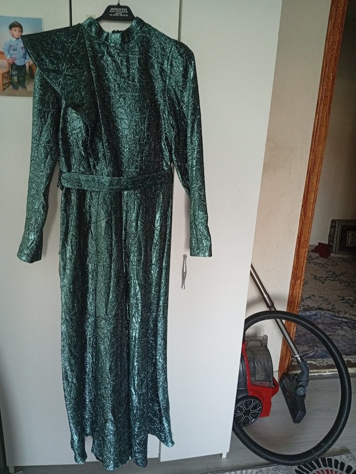 Yeşil parlak yılan desenli, yüksek yakalı, uzun kollu, beli kuşaklı, drapeli ve dar kesim uzun elbise. Parti ve sokak modasına uygun vintage tarz. ablamın düğününde aldım tek 5 saat giyildi uzun geldiği için sipariş iade süresi bitmişti