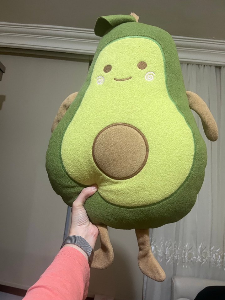 Yumuşak dokulu, pastel yeşil renkte, gülen yüzlü ve küçük kolları olan avokado peluş oyuncak.
