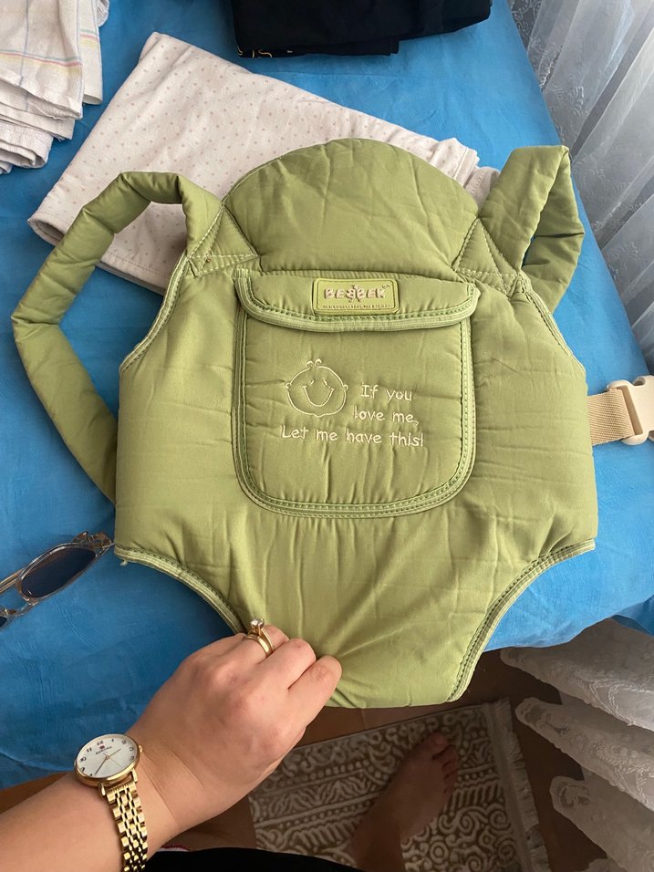 Yumuşak kumaşlı, ayarlanabilir askılı açık yeşil bebek taşıyıcı, önünde nakışlı cep bulunur isteyene WhatsApp’tan nasıl giydiğini atabilirim