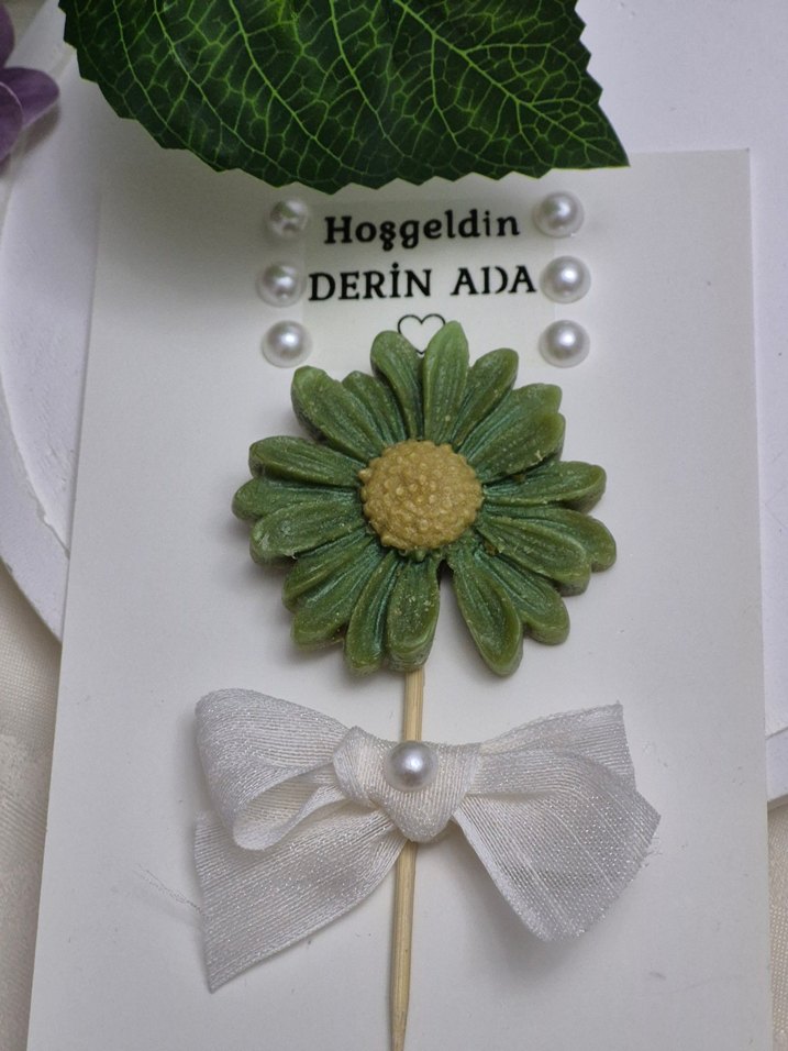 Beyaz fiyonk ve inci detaylı, yeşil pastel çiçek mum. #bebekhediyeligi