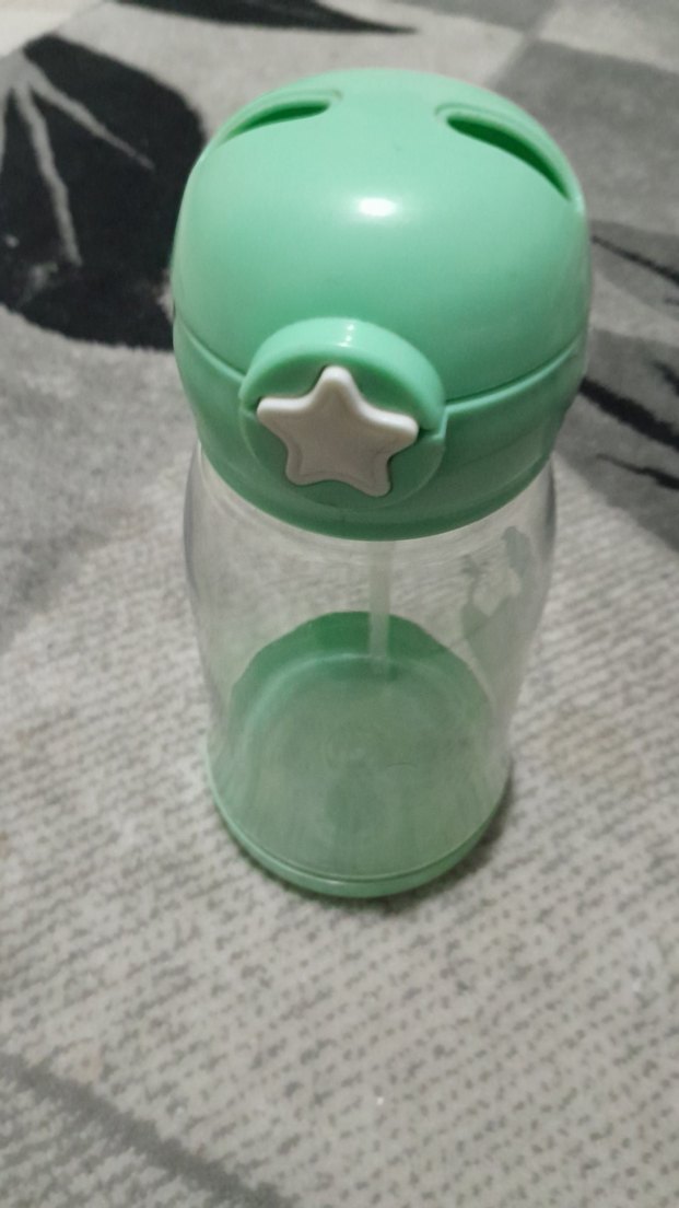 Pastel yeşil kapaklı, yıldız şekilli düğmeli ve şeffaf gövdeli çocuk suluk.