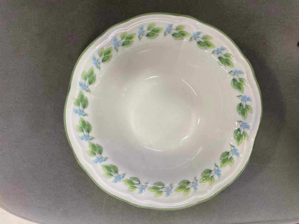Kenarında pastel yeşil çiçek desenleri bulunan seramik kase, yemek servisi için uygundur.
